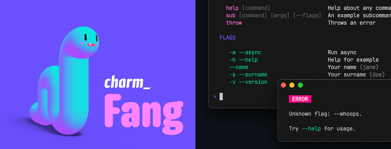 Charm Fang: A CLI Starter Kit for Cobra Apps — A new Charm release is always worth a look – they create fantastic, well-thought-out libraries. Fang is a layer on top of Cobra, adding fancy output/errors, man pages, completions, and other out-of-the-box UX improvements for CLI apps. It’s new so the docs are limited for now, but this example code will point you in the right direction. Charm |