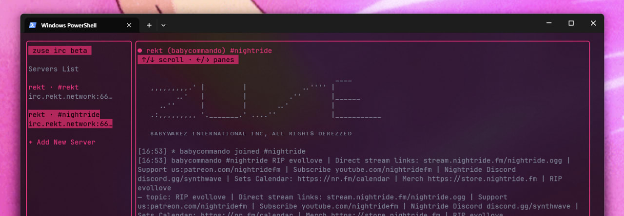 ZUSE: A Terminal-Based IRC Client — For the benefit of anyone younger than me, IRC (Internet Relay Chat) is a very long standing text-based chat system that had its heyday in the 90s and 00s, but is still alive today. This new Go-based IRC client is made with Bubble Tea and Lipgloss. Baby Commando |